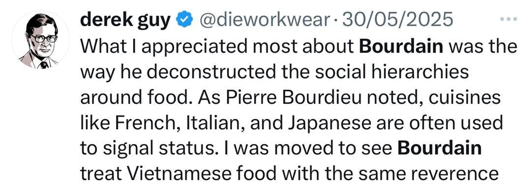 “What I appreciated most about Bourdain was the way he deconstructed the social hierarchies around food. As Pierre Bourdieu noted, cuisines like French, Italian, and Japanese are often used to signal status. I was moved to see Bourdain treat Vietnamese food with the same reverence.”