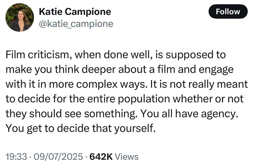 On the app formerly known as twitter, @katie_campione tweeted “Film criticism, when done well, is supposed to make you think deeper about a film and engage with it in more complex ways. It is not really meant to decide for the entire population whether or not they should see something. You all have agency. You get to decide that yourself.”